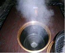 無煙ロースターダクト温水吸引洗浄中にはダクト配管内を温水で急速に熱するため、大量のミストを卓より噴出します。